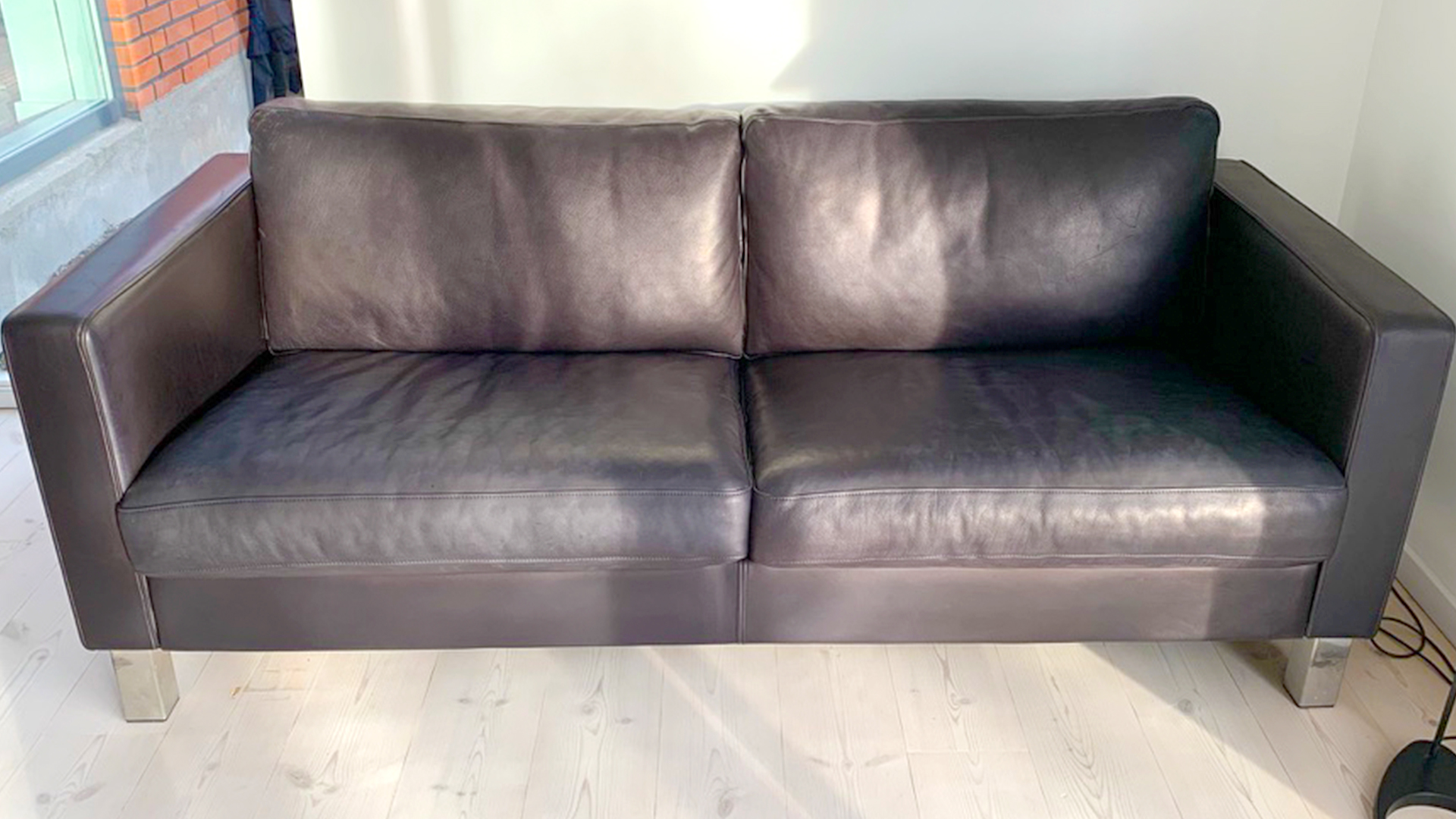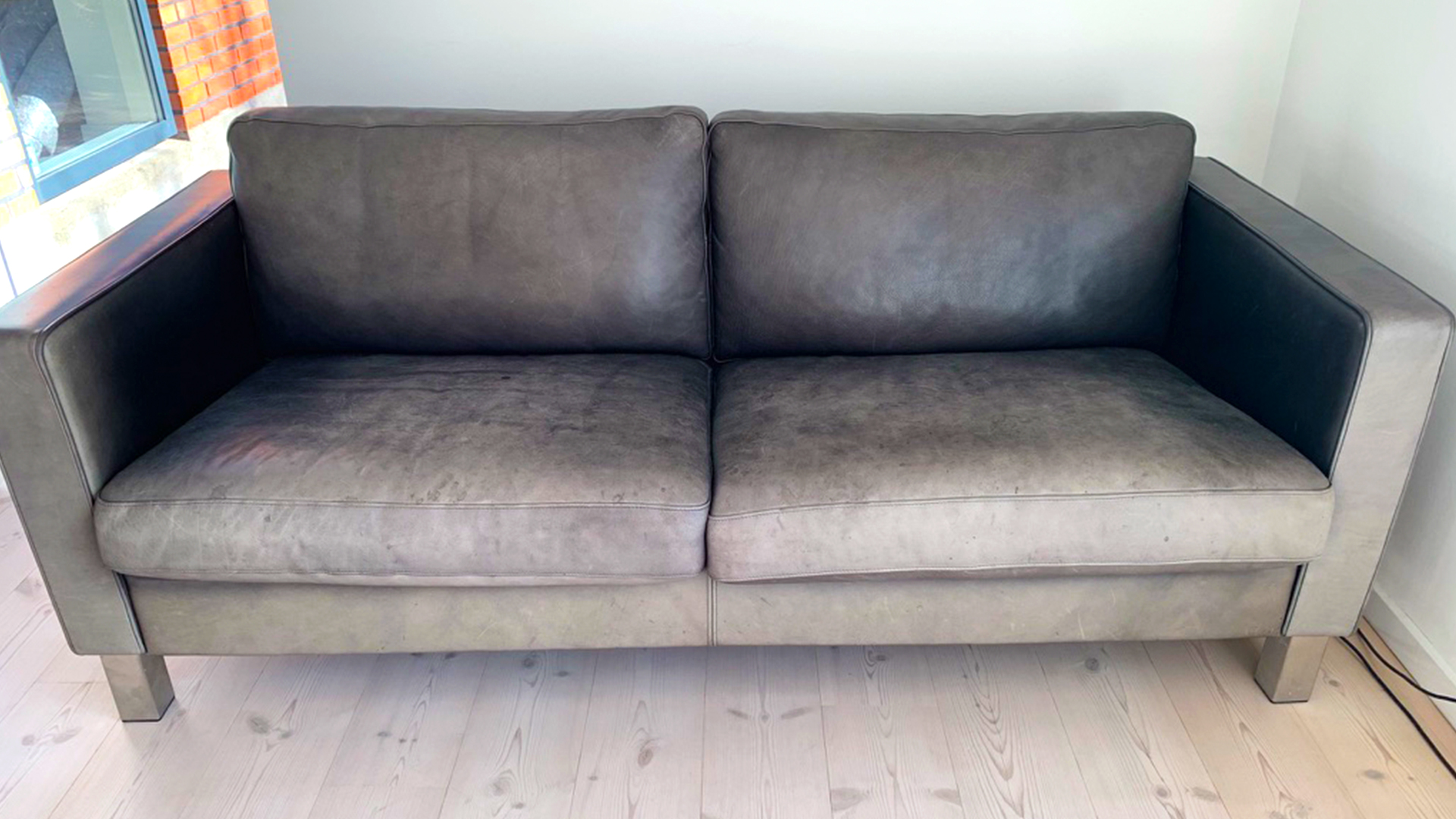 Narvsværte. Lædersofaen har stået i solen i nogle år og er derfor falmet.